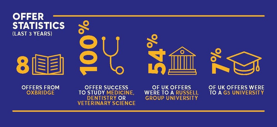 The breadth of top-quality universities our students progress onto globally is a fantastic success story. Our excellent results give students the opportunity to select from a wide range of prestigious universities around the world, and 90% of our students go to their first choice of university.